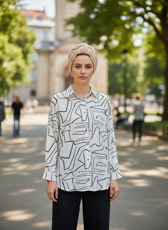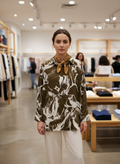 شومیز مانتویی کرپ حریر طرحدار که فری سایز است با قد 75 و عرض روی سینه 55 (110)